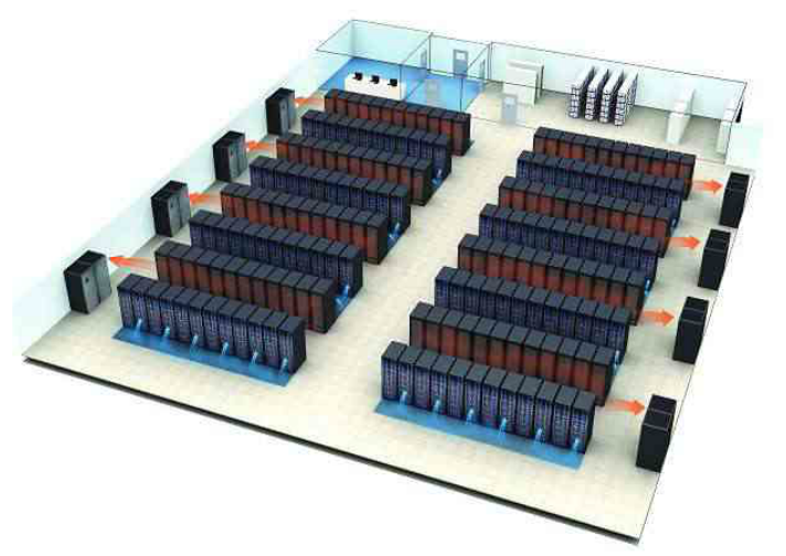 ? ?2、環(huán)境控制系統(tǒng),通常選用機(jī)房精密空調(diào)對(duì)數(shù)據(jù)中心的環(huán)境調(diào)節(jié),確保服務(wù)器等IT設(shè)備的運(yùn)行環(huán)境。對(duì)于發(fā)熱量大的服務(wù)器等IT設(shè)備,通常選用高通孔率(一般大于70%)網(wǎng)孔門的機(jī)柜,提高機(jī)柜進(jìn)出風(fēng)量;將機(jī)柜面對(duì)面、背對(duì)背布置,在機(jī)房?jī)?nèi)形成冷熱隔離的風(fēng)道,提高制冷效率:空調(diào)采用下送風(fēng)方式,確保機(jī)房送風(fēng)均勻,提高制冷效率。